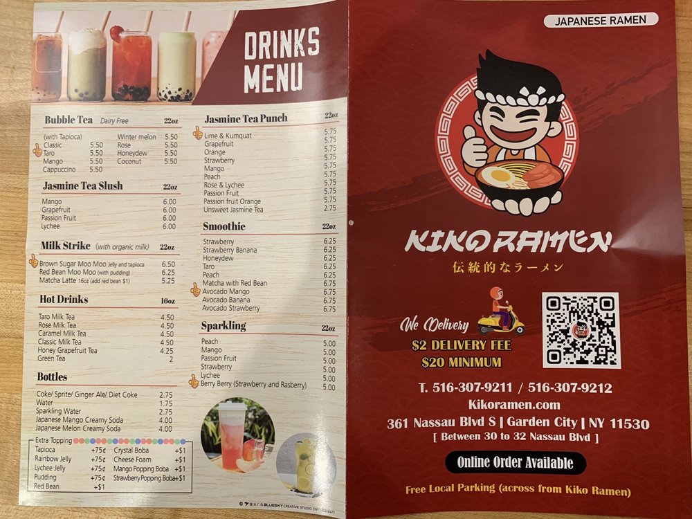 Introducing the menu at kiko Ramen, located in Garden City South, NY, is an exhilarating experience for ramen enthusiasts. This trendy yet casual spot offers a wide range of ramen options, including soy-free, vegan, and many vegetarian choices. The restaurant also provides alcohol, free Wi-Fi, and reusable tableware, making it a sustainable dining option. The menu caters to various dietary preferences and has options for everyone, ensuring a delightful dining experience. With excellent service, moderate noise levels, and the option for takeout or delivery, kiko Ramen is the perfect place for a group dinner or a satisfying solo meal. Don't miss out on the opportunity to enjoy delicious ramen dishes in a welcoming atmosphere at kiko Ramen.